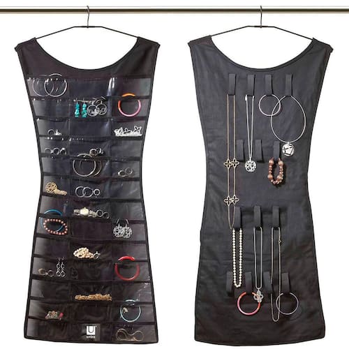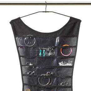 Esse organizador em formato de vestido possui duas faces: uma com bolsos com visor transparente e o outro lado com argolas para organizar colares e pulseiras.