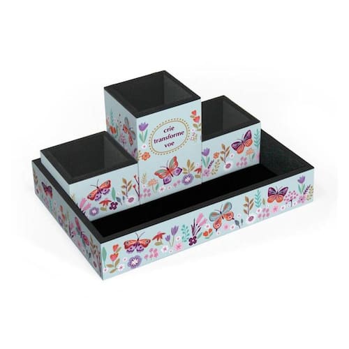 Organizador de mesa em MDF e acabamento interno em material aveludado preto. Contém: uma bandeja medidas: 23 cm comp. x 16 cm larg. x 4 cm alt. ; 2 porta-clips medidas: 7 cm comp. x 7 cm larg. x 5,0 cm alt. e 1 porta-lápis medidas: 7 cm comp. x 7 cm larg. x 10 cm alt. . Marca: Não Informado