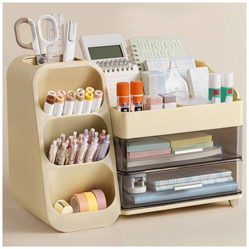 Este organizador de mesa HBlife em plástico ABS bege oferece estrutura única com porta-canetas dedicado, quatro compartimentos superiores e duas gavetas para armazenamento de itens de papelaria e pequenos acessórios. O design foi desenvolvido para uso sobre superfícies de trabalho em escritórios, residências, escolas e estúdios de arte.