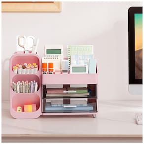 Este organizador de mesa HBlife em plástico ABS rosa oferece estrutura única com porta-canetas dedicado, quatro compartimentos superiores e duas gavetas para armazenamento de itens de papelaria e pequenos acessórios. O design foi desenvolvido para uso sobre superfícies de trabalho em escritórios, residências, escolas e estúdios de arte.