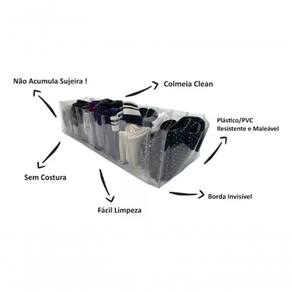 Este organizador é fabricado em Plástico PVC resistente e maleável, o que garante durabilidade e flexibilidade no uso, além de um design moderno e funcional. A borda invisível sem costura confere um acabamento discreto e sofisticado, sem acumular sujeira, tornando a peça extremamente fácil de limpar.