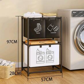 Espaços dedicados: três compartimentos removíveis para separar meias, roupas íntimas e demais peças, facilitando a rotina de lavagem. Transporte fácil: cestos removíveis para levar as roupas direto à máquina ou ao varal, sem esforço. Durabilidade e estilo: estrutura em metal resistente com design moderno que combina com qualquer lavanderia.