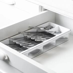 Os organizadores da Linha Clear permitem diversas composições e proporcionam máximo aproveitamento de espaço nas gavetas. São desmontáveis facilitando a limpeza. O Organizador de Talheres Clear traz 5 opções de organização e ícones indicando a setorização dos talheres. Possui espaço para facas, garfos, colheres e itens menores.