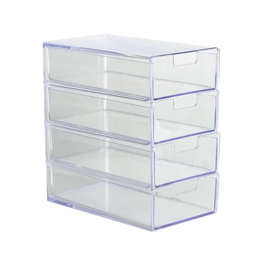 O Organizador Diamond da Paramount é uma solução de organização vertical compacta e elegante, possuindo quatro gavetas que deslizam facilmente e um corpo fabricado em Poliestireno resistente com acabamento totalmente transparente, permitindo a visualização rápida do conteúdo e adicionando sofisticação a qualquer ambiente. Com dimensões de aproximadamente 23,5 cm de altura, 13 cm de largura e 22,5 de profundidade, ele é ideal para ser colocado em bancadas, penteadeiras, closets ou escritórios, sendo perfeito para armazenar e manter ao alcance itens pequenos como óculos, maquiagens, acessórios, joias, materiais de escritório e itens de uso diário.