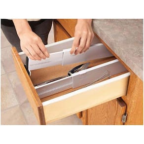 É muito fácil de usar, basta puxar a aba cinza para cima, em segundo lugar, estenda a divisoria para caber na sua gaveta. Por fim, empurre a aba cinza de volta para baixo para travar no lugar.