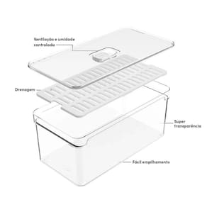 Com capacidade de 5 litros, este organizador é perfeito para armazenar frutas, legumes, verduras e outros alimentos na geladeira. Ele possui um escorredor na tampa, que permite que você lave os alimentos diretamente no organizador, evitando o uso de pratos extras e facilitando o seu dia a dia na cozinha.