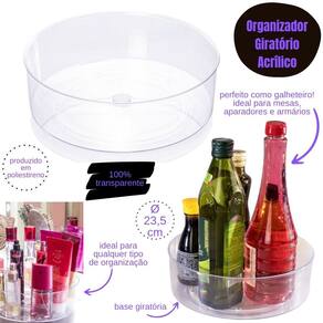 Organizador giratório produzido em poliestireno 100% transparente, atóxico e livre de bisfenol-A em sua composição (BPA Free), com base giratória que rotaciona 360 graus e facilita a segmentação dos produtos armazenados. Transparente como o vidro e leve como acrílico.
