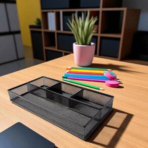 Com quatro divisórias, ele permite organizar diversos itens como canetas, lápis, clipes, blocos de nota, e outros acessórios de papelaria, facilitando o dia a dia e otimizando seu tempo.