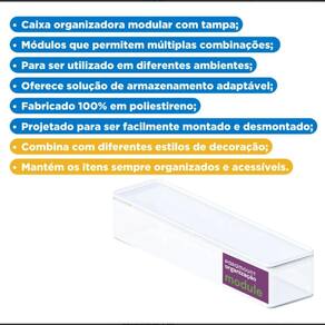Organizador Modular Multiuso Acrílico Module D1 27X6,8X5 cm Caixa Organizadora Module Multiuso com Tampa Acrílica - Empilhável A Caixa Organizadora Module Multiuso é a solução perfeita para quem busca praticidade, resistência e organização inteligente no dia a dia. Fabricada em poliestireno de alta qualidade, é um produto durável que protege seus itens com segurança, mantendo-os sempre livres de poeira graças à tampa em acrílico com encaixe preciso. Com design transparente e empilhável, ela facilita a visualização rápida do conteúdo e permite criar combinações modulares que otimizam o espaço de armazenamento, tornando seus ambientes mais funcionais e organizados. Ideal para organizar acessórios, objetos pessoais, itens de escritório, maquiagem, aviamentos de costura e muito mais, adaptando-se a diferentes necessidades. Diferenciais Alta resistência - Produzida em poliestireno de qualidade superior. Proteção garantida - Tampa inclusa, mantém o conteúdo seguro e livre de poeira. Design modular - Possibilidade de empilhar e personalizar a organização. Praticidade - Transparente, facilitando a identificação dos itens. Versatilidade - Ideal para casa, escritório ou . Especificações Dimensões AxLxP : 5,8 x 27,2 x 6,8 cm Acabamento: Transparente Material: Poliestireno de alta qualidade Marca: Arthi do vendedor: 10 meses Ref : 2078 Organize seus pertences de forma prática, elegante e eficiente com a Caixa Organizadora Module Multiuso com Tampa Acrílica - perfeita para manter tudo sempre no lugar