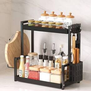 Organizador Multiuso Preto de Metal 2 Andares com Suporte Organizador Multiuso Preto de Metal 2 Andares com Suporte ===================================== Fabricado em metal resistente com acabamento moderno, este suporte oferece estrutura firme e durável, ideal para o armazenamento de temperos, utensílios, potes, talheres, frascos e muito mais.