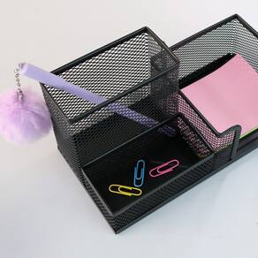 Esse organizador é super prático e manterá sua mesa sempre organizada, tanto em casa como no trabalho. Contém 3 divisórias para organizar seus lápis, canetas, marca textos, como também blocos de notas e clips.