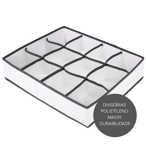 O Organizador 12 Divisórias Vizapi Classic Branco Cinza é ideal para quem deseja otimizar o espaço e a organização de armários e closets, com 12 nichos separadores, permite uma visualização e escolha mais rápida das suas peças. É a solução perfeita para organizar roupas íntimas, meias, gravatas, cintos e etc. Tamanho do Organizador: 43x35x9cm