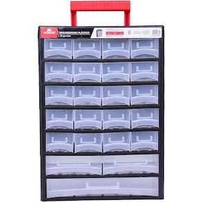 Especificações Marca: Worker Modelo: 940755 Cor: Preto Material: Plástico (Polipropileno injetado) Quantidade de compartimentos: 23 Largura: 31.5 cm Comprimento: 44.5 cm Profundidade: 14 cm Com rodas: Não Código universal de produto: 7899009003715 Itens Inclusos Organizador Plástico Worker 23 Gavetas Perguntas Frequentes (FAQ) Pergunta: Qual o material do organizador?