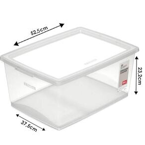 Garantia: 90 dias / Peso: 872g / Cor predominante: transparente / Ref.: OR80700; Dimensões: 52,5cm (C) x 37,5cm (L) x 23,5cm (A); Capacidade: 30 litros; Material: polipropileno; Conteúdo: 1 caixa organizadora; Cuidados: não lavar com materiais abrasivos; Obs.: o produto possui corpo e tampa transparentes, imagens com outras cores são somente ilustrativas.