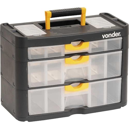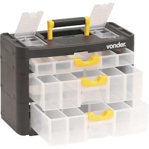 Conteúdo da Embalagem: 1 Organizador plástico. Possui alça para transporte, 3 gavetas e 2 compartimentos externos. Indicado para organizar e armazenar peças e acessórios em geral. Modelo:OPV 400 Material:Polipropileno Comprimento:400 mm Largura:200 mm Altura:285 mm Capacidade de carga (kgf):9 kgf Cor do organizador para ferramentas:Preto e transparente Massa aproximada (peso):2,39 kg