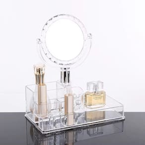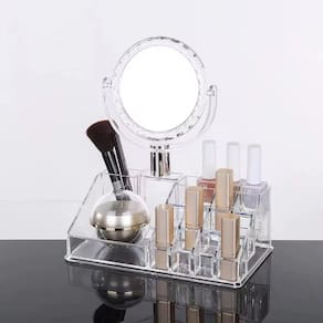 Transforme sua rotina de beleza com o incrível organizador porta-maquiagem em acrílico com espelho agora, seus produtos favoritos estarão sempre organizados, e você terá um espelho prático para facilitar sua maquiagem.