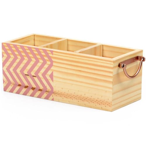 - Fabricado em Madeira Pinus - Possui 3 Divisórias - Possui um charmoso desenho lateral em forma de Zig Zag - Possui 2 alças em Ferro - Medidas: 10x18x10cm AXLXC - Muito Charme
