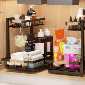 -?Obtenha 150% de espaço de armazenamento?O organizador embaixo da pia Sevenblue de 2 camadas é a solução perfeita para maximizar o armazenamento em espaços pequenos. Seu design versátil o torna ideal para uso em cozinhas, banheiros, salas de estar, armários e muito mais, ajudando você a manter tudo arrumado e organizado.