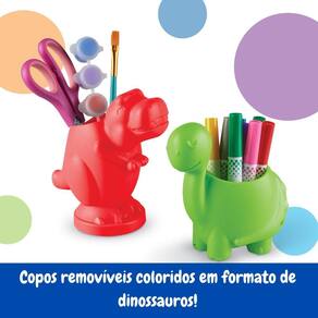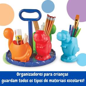 Design perfeito para mãos pequenas Desenvolvido pensando nas crianças, o organizador inclui 4 copos de plástico removíveis que são ideais para armazenar suprimentos diversos, como tesouras, lápis de cor, giz de cera e muito mais. Os dinossauros simpáticos ajudam a tornar a limpeza uma brincadeira, incentivando a organização com diversão.