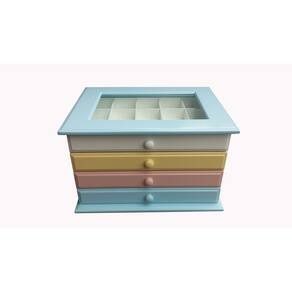 Nossos organizadores irão facilitar seu dia a dia com a organização e segurança que sua coleção precisa, além de proporcionar um ambiente mais sofisticado e elegante para qualquer idade. Produzida com MDF. A parte superior do gaveteiro, a tampa, possui visor com vidro transparente de 2 mm. Laqueado por fora e colorido por dentro podendo trocar de posição as suas gavetas. As gavetas tem divisórias diferenciadas de acordo com que você queira guardar, podendo guardar jóias, relógios, pulseira, anel, brinco e etc. Características do Organizador: - Cor externa, Colorido Laqueado , - Cor externa, Azul Laqueado , - Tampa de vidro 2 milímetros, - 4 gavetas com divisórias diferenciadas internas, - Tamanho do Organizador, 34X26X21, Relógios e jóias não acompanham o organizador - Imagens meramente ilustrativas