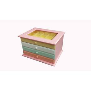 Nossos organizadores irão facilitar seu dia a dia com a organização e segurança que sua coleção precisa, além de proporcionar um ambiente mais sofisticado e elegante para qualquer idade. Produzida com MDF. A parte superior do gaveteiro, a tampa, possui visor com vidro transparente de 2 mm. Laqueado por fora e colorido por dentro podendo trocar de posição as suas gavetas. As gavetas tem divisórias diferenciadas de acordo com que você queira guardar, podendo guardar jóias, relógios, pulseira, anel, brinco e etc.
