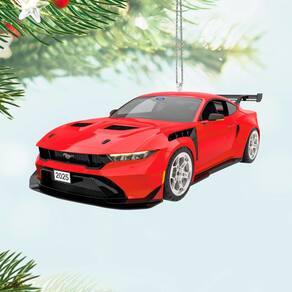 - Entre nas festas de fim de ano com este enfeite de Natal 2025 Ford Mustang GTD Hallmark Keepsake com um design de carro esportivo de metal vermelho com rodas que giram.
