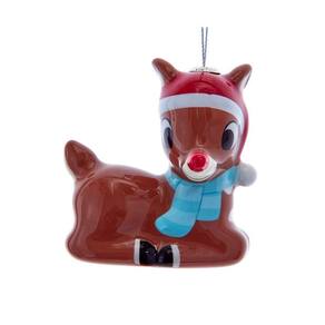 O enfeite de decoupage Rudolph The Red Nose Reindeer de Kurt Adler é uma adição divertida e festiva a qualquer decoração natalina ou árvore de Natal. Rudolph aparece sentado usando um chapéu de Papai Noel vermelho e branco e um lenço listrado azul.