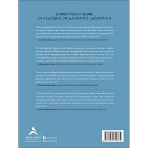 “Este não é apenas um livro; é um convite urgente para o tipo de autoexame rigoroso que levará a avanços em todos os relacionamentos de sua vida. Clark nos oferece um exemplo e um caminho para criar os sistemas sociais saudáveis que desejamos e lidarmos com as demandas modernas de florescimento corporativo.” — Joseph Grenny, autor de Crucial Conversations, best-seller do New York Times “Os 4 Estágios da Segurança Psicológica incorporam a progressão lógica e natural de uma equipe saudável e de alto desempenho. Ele fornece um roteiro para as equipes que se esforçam para criar o melhor ambiente para o sucesso. Eu o uso consistentemente para monitorar a saúde da minha própria equipe, aplicando a estrutura a cada indivíduo, tanto profissionalmente quanto pessoalmente.” — Libby Macomber, Diretora da Desenvolvimento Comercial da Celemi “Como responsável pelo desenvolvimento de funcionários em 65 países, posso dizer que este livro delineia uma cultura obrigatória. Um espaço seguro é uma aposta para qualquer organização que procura atrair e reter talentos e inovar em cada nível. Um poderoso apelo à ação.” — Simone Ciafardini, Vice-presidente da Clinique Global Education “Como você invoca o gênio coletivo de uma organização inteira? Posso lhe dizer que o livro de Timothy Clark tem a resposta. Se as organizações criam uma cultura de segurança psicológica, elas podem enfrentar uma competição feroz, aproveitando o poder da inclusão para impulsionar a inovação. É um guia de sobrevivência para o século 21.” — Juan Carlos Linares, Presidente da Lee Hecht Harrison, Bogotá, Colômbia