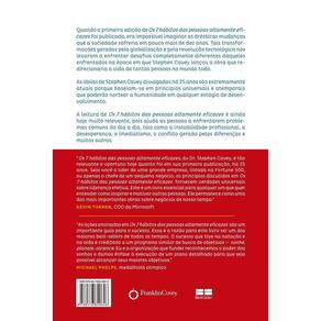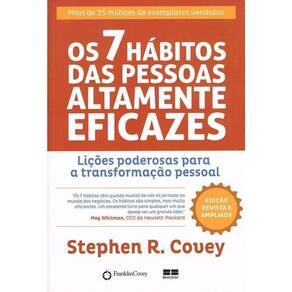 "O livro de negócios mais importante do Século XX. Presença constante na lista de best-sellers, Os 7 hábitos das pessoas altamente eficazes agora em edição revista e ampliada, para comemorar seus 25 anos. Desde a primeira publicação da obra, muita coisa mudou no mundo empresarial e político. No entanto, os 7 hábitos estabelecidos por Stephen Covey são eternos e imutáveis, guiando e ajudando inúmeras pessoas neste meio século - sejam elas chefes de Estado ou indivíduos comuns. Os 7 hábitos das pessoas altamente eficazes é uma abordagem holística e integrada à solução dos problemas pessoais e profissionais baseada em princípios. Com mais de 25 milhões de exemplares vendidos e traduzido para 38 idiomas, este manual revolucionário nos mostra como alcançar a paz de espírito e adquirir confiança por meio dos alicerces do comportamento humano no caráter e da compreensão dos princípios, não se detendo apenas a práticas. Desde a primeira edição deste livro, os 7 hábitos mudaram não apenas o que as pessoas pensam sobre influência e realização pessoal, como também as atitudes motivadas por essas ideias. Os 7 hábitos, na verdade, modificaram a linguagem que usamos, a partir dos seguintes conceitos: seja proativo; comece com o objetivo em mente; primeiro o mais importante; pense ganha/ganha; procure primeiro compreender, depois ser compreendido; crie sinergia; afine o instrumento. O livro Os 7 hábitos das pessoas altamente eficazes, um dos grandes clássicos da nossa época, tornou-se um fenômeno internacional. Stephen R. Covey e sua obra serão sempre lembrados por terem recriado e trazido a público tão valiosos princípios. "