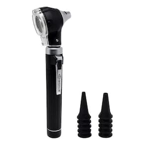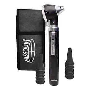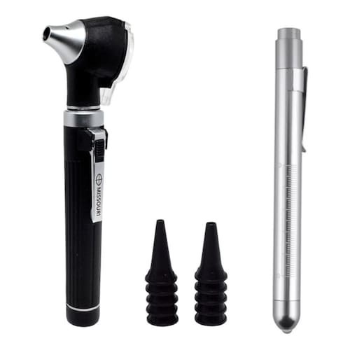 Otoscópio LED Missouri + Lanterna Prata Acompanha: 02 Lâmpadas: Sendo 01 com Luz Branca e 01 com Luz Amarelada 01 Cabeça de Otoscopio Com Lente com aumento de 2,5 vezes 01 Cabo De Otoscopio 01 Estojo para acondicionamento; 05 Espéculos Descartáveis Nº1 de 2,5mm. 05 Espéculos Descartáveis Nº2 de 4,0mm. 01 Lanterna clínica com luz de LED