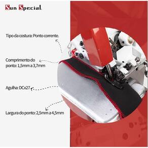 Tipo da costura: Ponto corrente Comprimento do ponto: 1,5mm a 3,7mm Largura do ponto: 2,5mm a 4,5mm Agulha: DCx27 Velocidade máxima: 1.350ppm Motor acoplado ao cabeçote Potência Motor: 150W Tensão: 220V