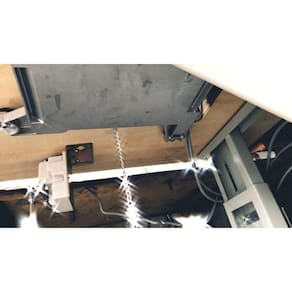 As máquinas acompanham estante com regulagem de altura que seguem os padrões de conforto e ergonomia para o operador, além de tampo em madeira revestido em fórmica.