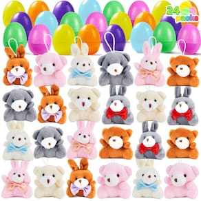 - Pacote com ótimo custo-benefício. Nosso conjunto de ovos de Páscoa pré-cheios inclui 12 coelhinhos de pelúcia e 12 ursos de pelúcia. Ovos de 5 cm preenchidos com chaveiro de animal de pelúcia. É muito delicado e macio, uma surpresa perfeita até mesmo para crianças pequenas!
