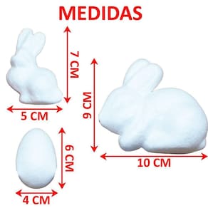 - Dimensões: Coelho G 10x9cm x Coelho P 7x5cm x Ovos 6x4cm