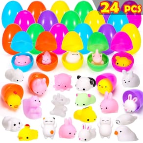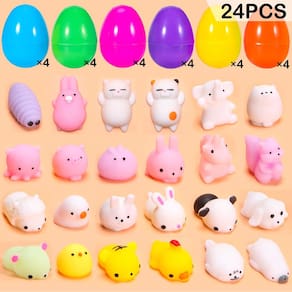 YEAHBEER 24 peças de brinquedos mochi de ovos de páscoa preenchidos, mini brinquedos macios para alívio de desconforto para cesta de Páscoa, suprimentos de festa de caça aos ovos de Páscoa - 24 Ovos de Páscoa preenchidos com brinquedos Mochi, ovos de plástico surpresa em diferentes cores com diferentes tipos de pequenos brinquedos. As crianças ficarão encantadas ao descobrir a surpresa em cada ovo de Páscoa que caçam! É um ótimo presente para todos os meninos e meninas - Ovos de Páscoa cheios de brinquedos, incluindo mini brinquedos macios para alívio de desconforto, muito popular entre as crianças - Os ovos de Páscoa pré-cheios têm cascas de ovo mais grossas e em cores sólidas e brilhantes e diversas. Você pode encher cada cesta de Páscoa com tantos ovos de Páscoa e uma variedade de mini brinquedos populares que podem fazer as crianças brincarem mais felizes - Ótima opção para presentes de páscoa para caçar ovos de Páscoa, enchimentos de cesta, decoração temática de Páscoa, suprimentos para prêmios de sala de aula. Estes brinquedos de Páscoa trarão diversão infinita para sua família - Seguro e durável. Todos os brinquedos de pelúcia de cesta de Páscoa são feitos de plástico 100% não tóxico, seguros para todas as meninas e meninos, muito delicados e vívidos. As cores ousadas e os rostos animados desses brinquedos podem atrair atenção instantaneamente em festas infantis