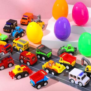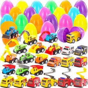 24 Ovos de Páscoa preenchidos com mini carros de construção de 8 cm para caça aos ovos de Páscoa, enchimentos/enchimentos de cesta de Páscoa, guloseimas de enchimento, lembrancinhas de festa, suprimentos para prêmios de sala de aula Pacote supereconômico. Nossos ovos de Páscoa preenchidos incluem 24 carros de puxar. Os ovos medem 8 cm cada para horas de diversão na festa de caça aos ovos de Páscoa.