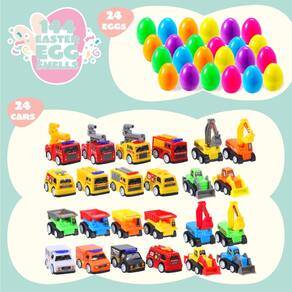 - Pacote supereconômico. Nossos ovos de Páscoa preenchidos incluem 24 carros de puxar. Os ovos medem 8 cm cada para horas de diversão na festa de caça aos ovos de Páscoa.