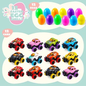 Pacote supereconômico. Nossos ovos de Páscoa recheados incluem 12 peças de ovos de Páscoa. Cada ovo mede 9,7 cm. O conjunto vem com 12 variedades de carros monstro.