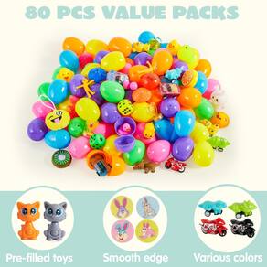 - Pacote supereconômico. Este pacote inclui 80 peças de ovos que vêm em 6 cores brilhantes diferentes com 40 tipos de brinquedos inovadores e cada ovo vem com um adesivo fofo. Cada ovo mede 6 cm.
