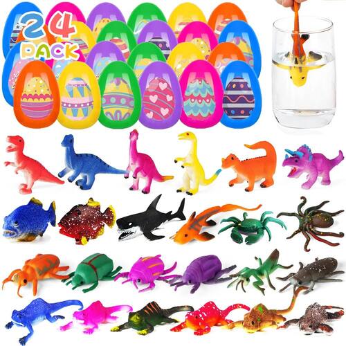 - Conjunto de ovos de plástico pré-cheios: cada conjunto inclui 24 peças de ovos de plástico (6 cores, medida 7 x 5 cm) e etiquetas de ovos, 24 peças de brinquedos de animais que mudam de cor: 6 tipos de animais marinhos, 6 tipos de brinquedos de dinossauro, 6 tipos de brinquedos de lagarto, 6 tipos de brinquedos de insetos e instruções de brincadeira.