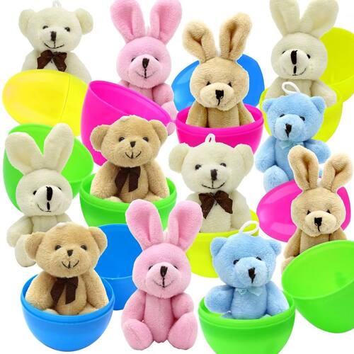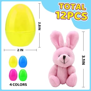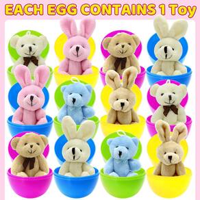 - ?12 ovos de Páscoa pré-cheios com coelhinho e ursos de pelúcia?Este pacote vem com 6 coelhos de pelúcia e 6 ursinhos de pelúcia. Cada animal de pelúcia é combinado com uma corda forte, que é conveniente para você pendurar em qualquer lugar que quiser! Ovos de Páscoa cheios de brinquedos economizarão seu tempo. A quantidade de ovos de Páscoa é suficiente para atender às suas necessidades festivas.