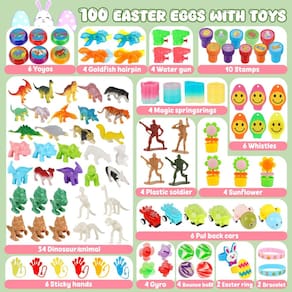 - Ovos de Páscoa cheios de brinquedos, incluindo dinossauros. Carimbos, carros, soldados de plástico, paraquedistas, apitos, molas mágicas, anéis, mãos pegajosas, ioiôs e etc. Muito popular entre as crianças