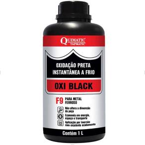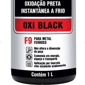 Oxi Black F9 é uma composição de agentes oxidantes fortes, à base de ácidos inorgânicos, que promove a oxidação completa e instantânea de superfícies metálicas, formando uma camada preta de acabamento. Indicado para armamentos, ferramentas, parafusos, porcas, objetos de decoração, etc. Aplicável por imersão da peça na solução de Oxi Black. Fornecido em embalagens plásticas de 1L. Durável, consistente e uniforme. Sem alteração dimensional ou estrutural. Economia de energia (processo a frio). Odor: característico, picante Densidade a 25ºC: 1,05 - 1,20 g/mL Conteúdo: 1L Dimensões: 95 x 200mm Peso: 1,183kg Marca: Tapmatic Modelo: Oxi-Black F9 SKU: 13020