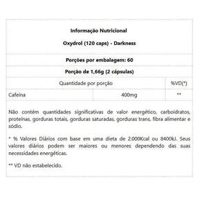 Oxydrol 120 caps - Padrão: Único Oxydrol 120 caps O termogênico mais pesado do Brasil, pensado para aumentar a corporal de forma eficiente e definitiva. O Oxydrol Darkness conta com alta concentração de cafeína, 400 mg por dose, atua como um intenso energético, capaz de favorecer o desempenho durante os treinos. Termogênico com alta concentração de cafeína, atua como um intenso energético, capaz de favorecer o desempenho durante os treinos e otimizar a metabolização da gordura corporal O uso de termogênicos é indicado para quem deseja acelerar o processo de perda de gordura, já que a cafeína tem uma grande ação na e principalmente no aumento do nosso metabolismo. O aumento do metabolismo pode perdurar por horas após seu consumo, o que aumenta o gasto calórico durante o dia. Pode ser utilizado antes do treino aproximadamente 30 minutos antes para otimizar a performance, ou qualquer outro momento do dia, para acelerar o metabolismo e a . Por ser um neuro seu consumo durante o período noturno não é indicado, pode causar insônia. benefícios: - ;- Ação Termogênese;- Aumento de Energia;- 400 mg Cafeína;- Rápida Absorção.