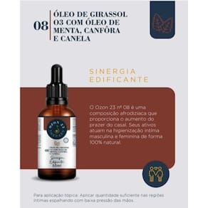 Óleo Nº 08 - Sinergia Edificante Para momentos de mais prazer com seu/sua parceiro/parceiraNosso óleo nº08 é uma composição afrodisíaca que proporciona o aumento do prazer do casal. Seus ativos atuam na higienização íntima masculina e feminina de forma 100% natural.Além disso, é um produto 100% natural ausência de qualquer elemento sintético , não possui conservantes, corantes ou fragrâncias e não foi testado em animais.Modo de usar: Aplicar quantidade suficiente nas regiões íntimas espalhando com baixa pressão das mãos.Composição do óleo:1.Óleo de girassol ozonizado 2.Óleo de menta3.Cânfora4.CanelaDicas para melhor armazenar o seu óleo ozonizado:1.Não expor ao sol 2.Sempre se certificar de ter fechado bem o frasco após o uso3.Manter longe do alcance de crianças Marca: Ozon 23