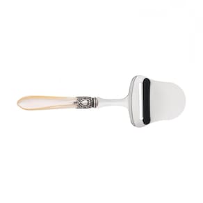 Para garantir uma mesa elegante e com espírito régio a pá para queijo da linha Oxford da Bugatti foi produzida em aço inox 18/10, com cabo de madrepérolaem acrílico enriquecido por um sofisticado anel com acabamento em prata antiga que lembra um nobre brasão.