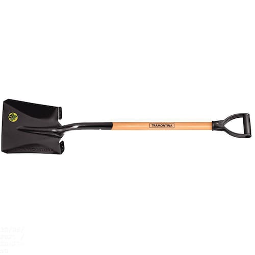 Muito mais conforto e qualidade com a pá quadrada Tramontina 417/20 em aço com cabo de madeira 71 cm com empunhadura plástica reta ergonômica. Garantindo todo o diferencial das ferramentas Tramontina, ela é produzida com sistema de corte a laser, trazendo toda a resistência do aço carbono temperado. Além disso, recebe pintura eletrostática a pó, que protege contra oxidação. Traz ainda cabo de 71 centímetros produzido em madeira envernizada, que apresenta design ergonômico e empunhadura plástica, proporcionando um manuseio mais confortável e mais facilidade no trabalho. Orientações - A pá é fabricada em aço carbono especial de alta qualidade, cortada a laser.- É temperada em todo o corpo da peça, proporcionando maior resistência e menor desgaste durante o uso.- Recebe pintura eletrostática a pó, que tem uma melhor apresentação visual e maior proteção contra oxidação.- A tinta utilizada na pintura é isenta de metais pesados na sua composição, o que minimiza o impacto ambiental.- O cabo de 71 cm desta ferramenta, além de possuir ótima resistência, é produzido com madeira de origem renovável.- Cabo com acabamento envernizado, para um melhor acabamento e apresentação do produto. A camada protetora em verniz incolor realça sua tonalidade, concedendo brilho e um toque mais liso ao produto.- Possui empunhadura plástica ergonômica. Características Gerais EAN13 7891117097785 DUN14 17891117097782 NCM 8201.10.00 Peso Líquido 1,7290 kg. Peso Bruto 1,7300 kg. Metragem 0,007343 m³. Dimensões Embalagem (Compr. X Larg. X Alt.) 1.045x 242x 100 mm. Dimensões Produto (Compr. X Larg. X Alt.) 1.045x 242x 100 mm. Cor 1 000000 Hexa Observações - A pá é utilizada na agricultura, jardinagem e construção civil, para juntar ou carregar materiais diversos (como areia, cascalho e terra) em superfícies planas.- Para descarte dos produtos e embalagens siga as orientações de reciclagem vigentes.