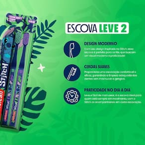 A cabeça de tamanho adequado facilita o alcance de todos os dentes, contribuindo para uma limpeza completa. As escovas são decoradas com os personagens Lilo e Stitch. Cada embalagem contém duas unidades azuis, cerdas e desenhos com cores diversas entre azul, verde e roxo.