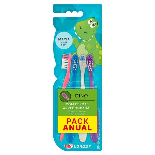 Escova Dental Dino promove saúde total para boquinha das crianças. Cerdas com corte reto e pontas arredondadas e cabo com texturas proporcionam segurança e conforto durante a escovação. Disponível na versão Macia em 4 cores.