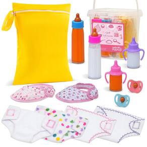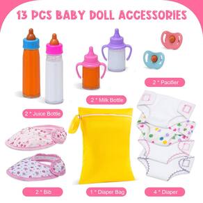 - O pacote inclui: 13 acessórios para bonecas de bebê incluem 2 garrafas de leite mágicas, 2 garrafas de suco mágico, 2 chupetas de brinquedo, 4 fraldas de boneca, 1 bolsa de fraldas, 2 babadores. (Observação: Boneca não incluída)